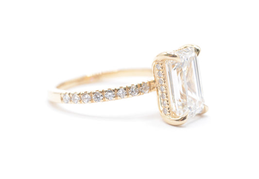 3ct emerald cut lab grown diamond center igi certified F color VS1 14k yellow gold diamond pave setting with accented unerhalo