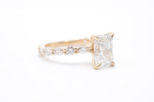 2ct radiant lab diamond center f color VS1 with alternating round/marquis diamond setting 14k yellow gold