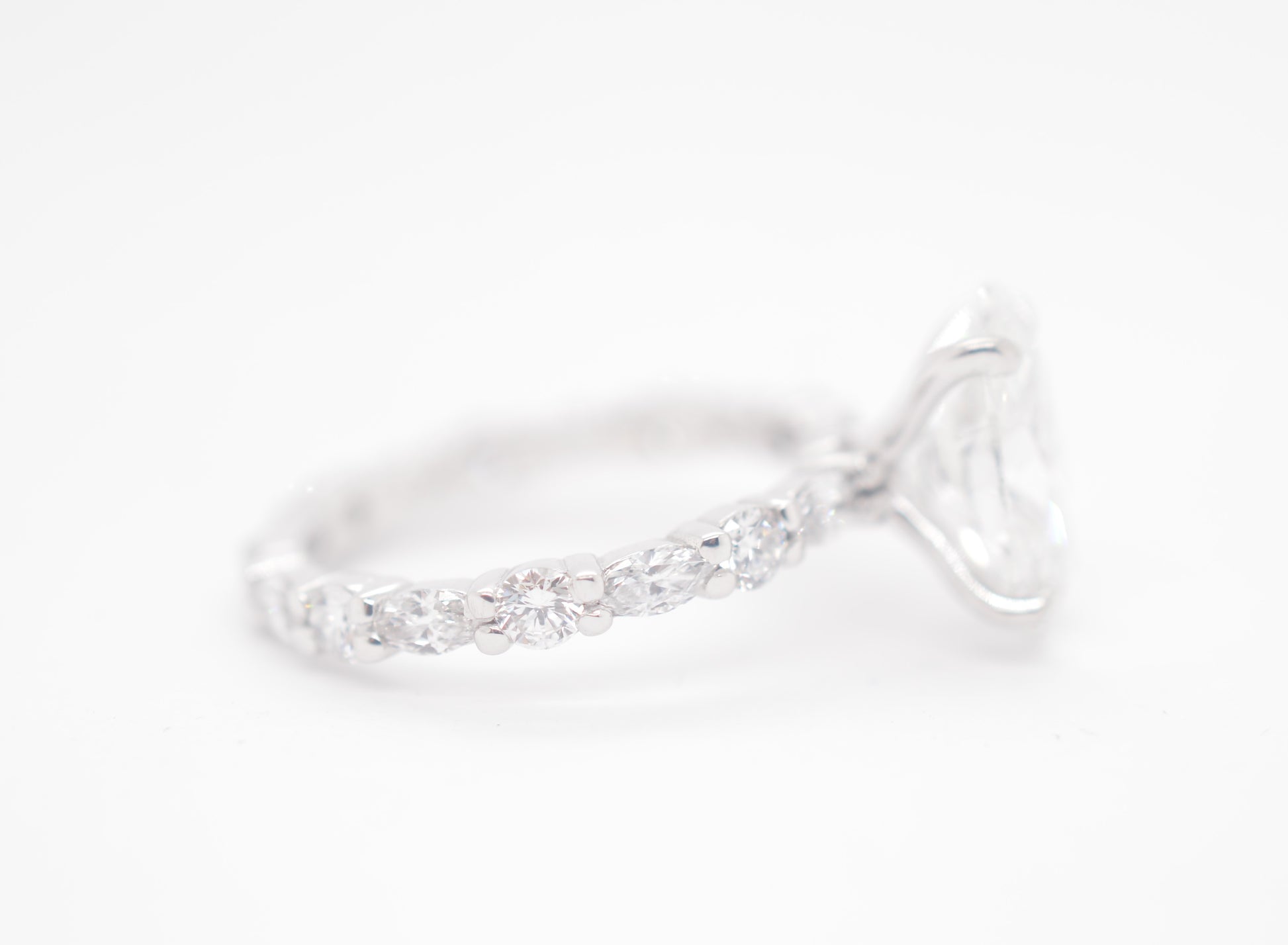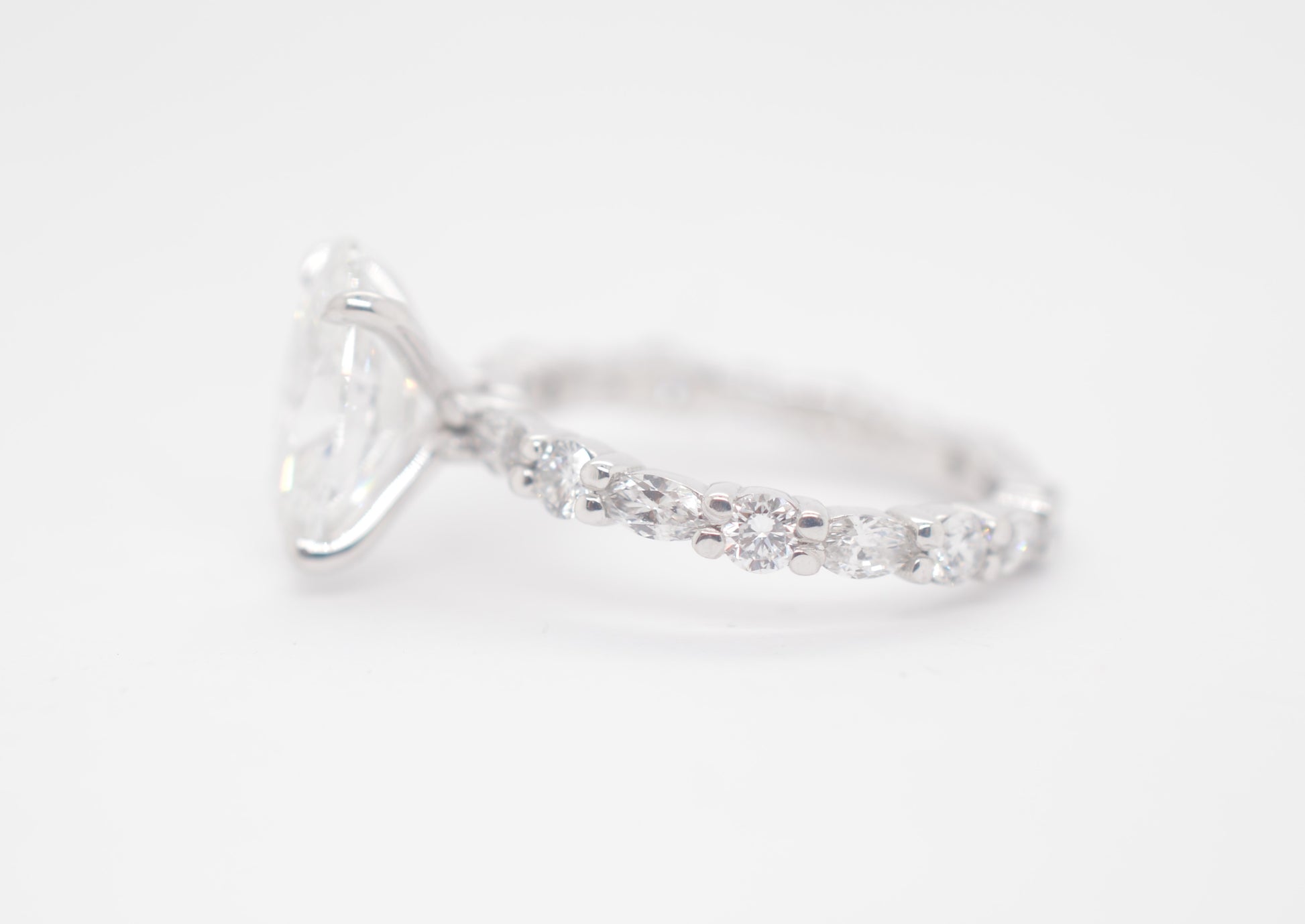 2.5ct Oval Lab diamond center IGI certified f color vs1 in custom marquis/round alternating eternity 14k white gold.