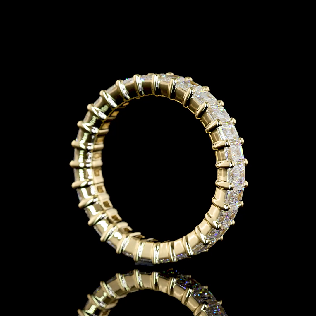 This timeless Full Eternity Band is meticulously crafted in 14k Yellow Gold, featuring 2.88 CTTW of Emerald diamonds (E color, VS clarity) that dazzle with every movement. A perfect piece to enhance any jewelry collection.